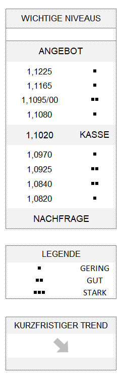 Zum Wochenschluss machte sich indes abermals Risikoaversion im Euro-Handel breit: Die Gemeinschaftswährung schloss unweit des Wochen-Tiefs, rangiert aber dennoch relativ leblos in ihrem kurzfristigen Aufwärtstrend zwischen 1,1095/00 und 1,0840.